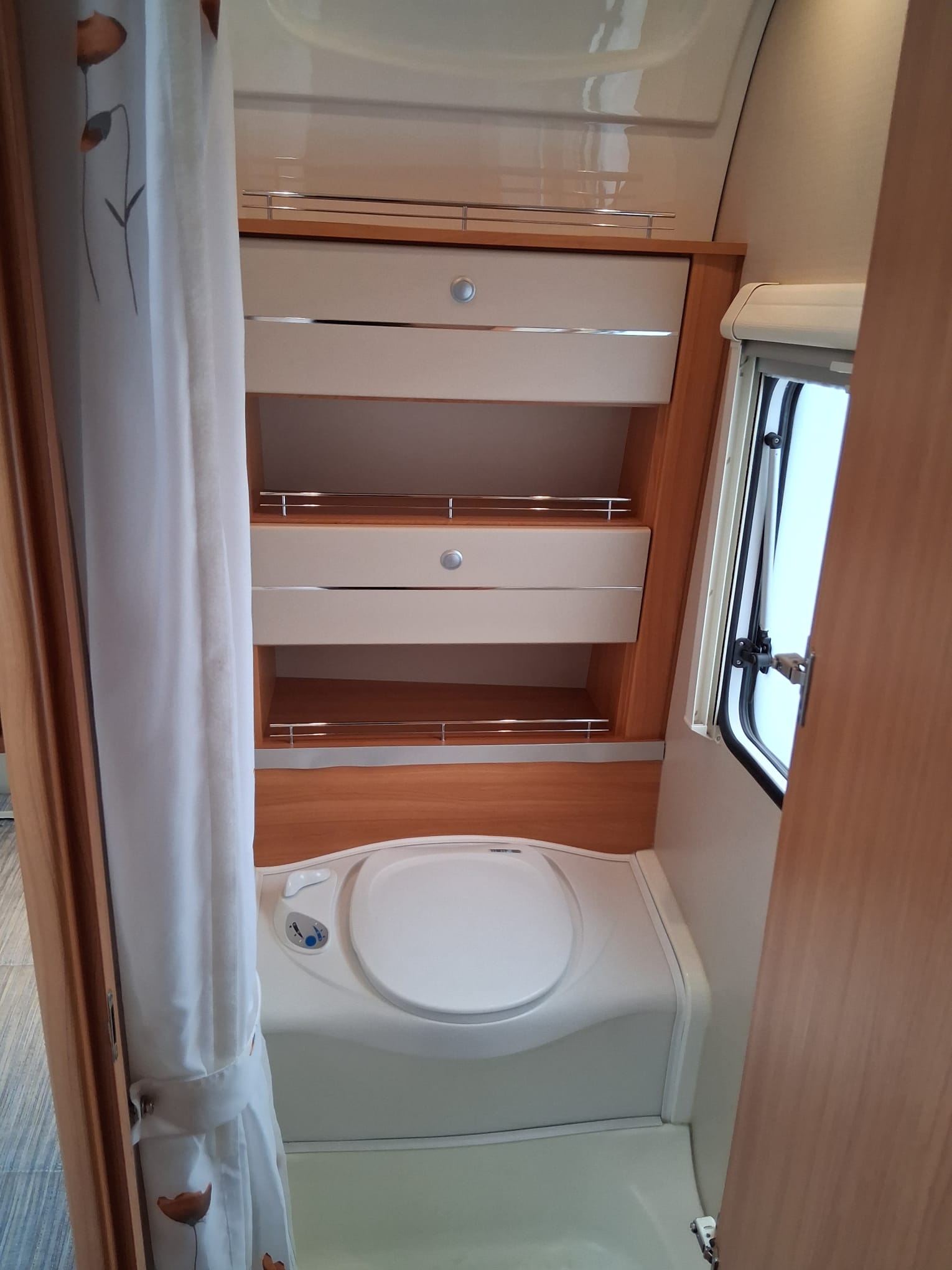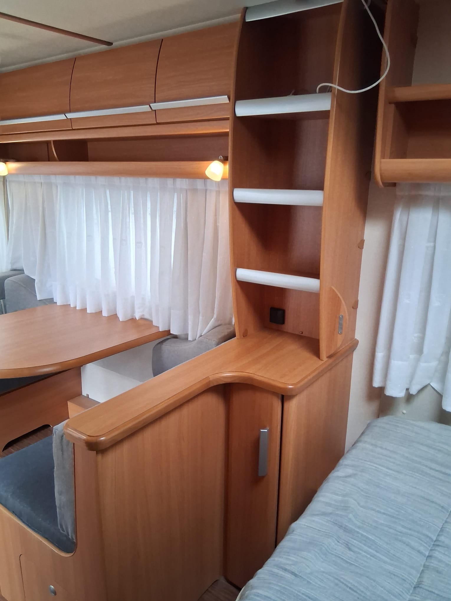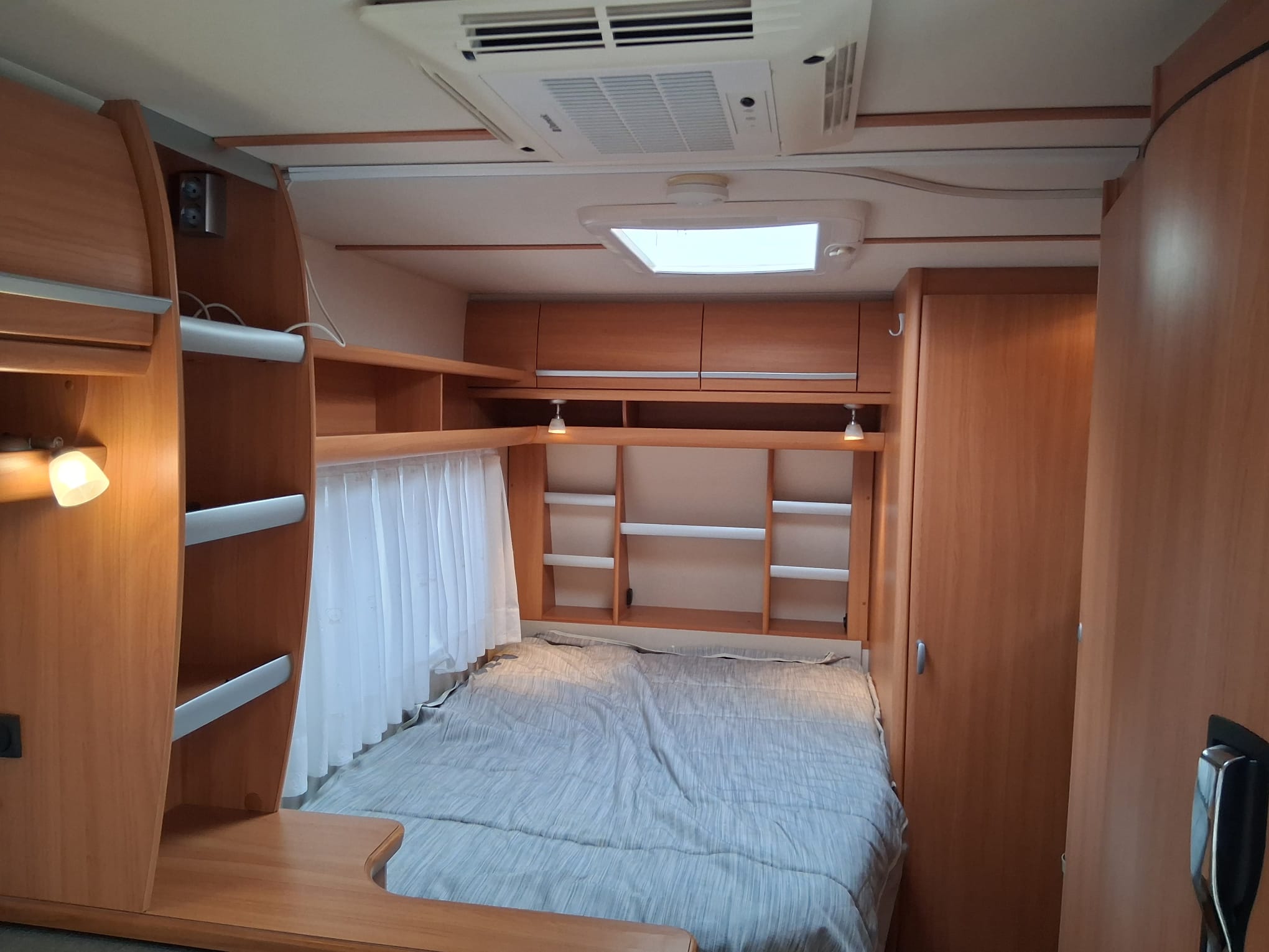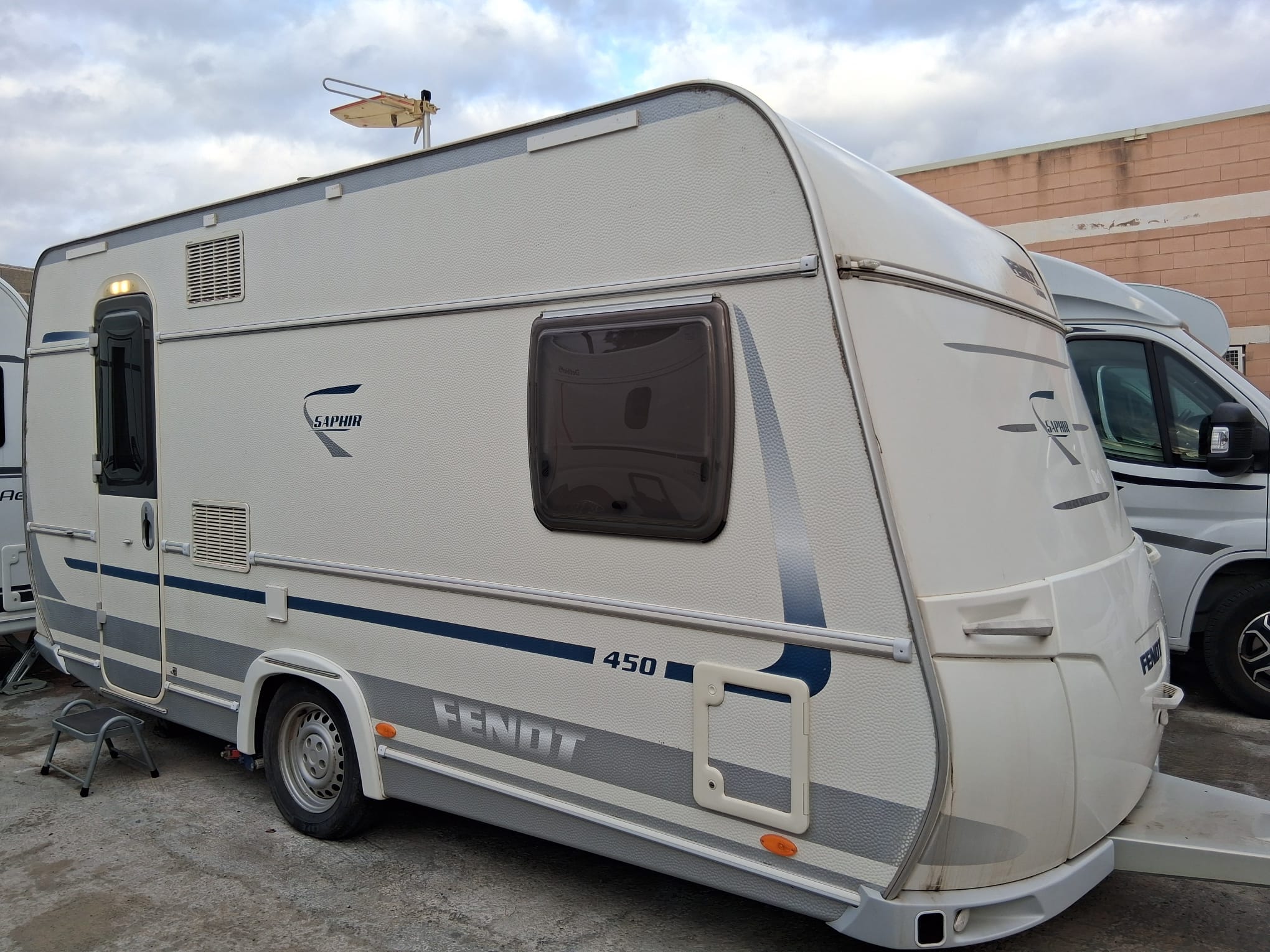 Caravana de ocasión con 4 plazas con cama francesa y salón transformable en cama con mucho equipamiento extra: mover, aire condicionado, nevera grande, estabilizador …..