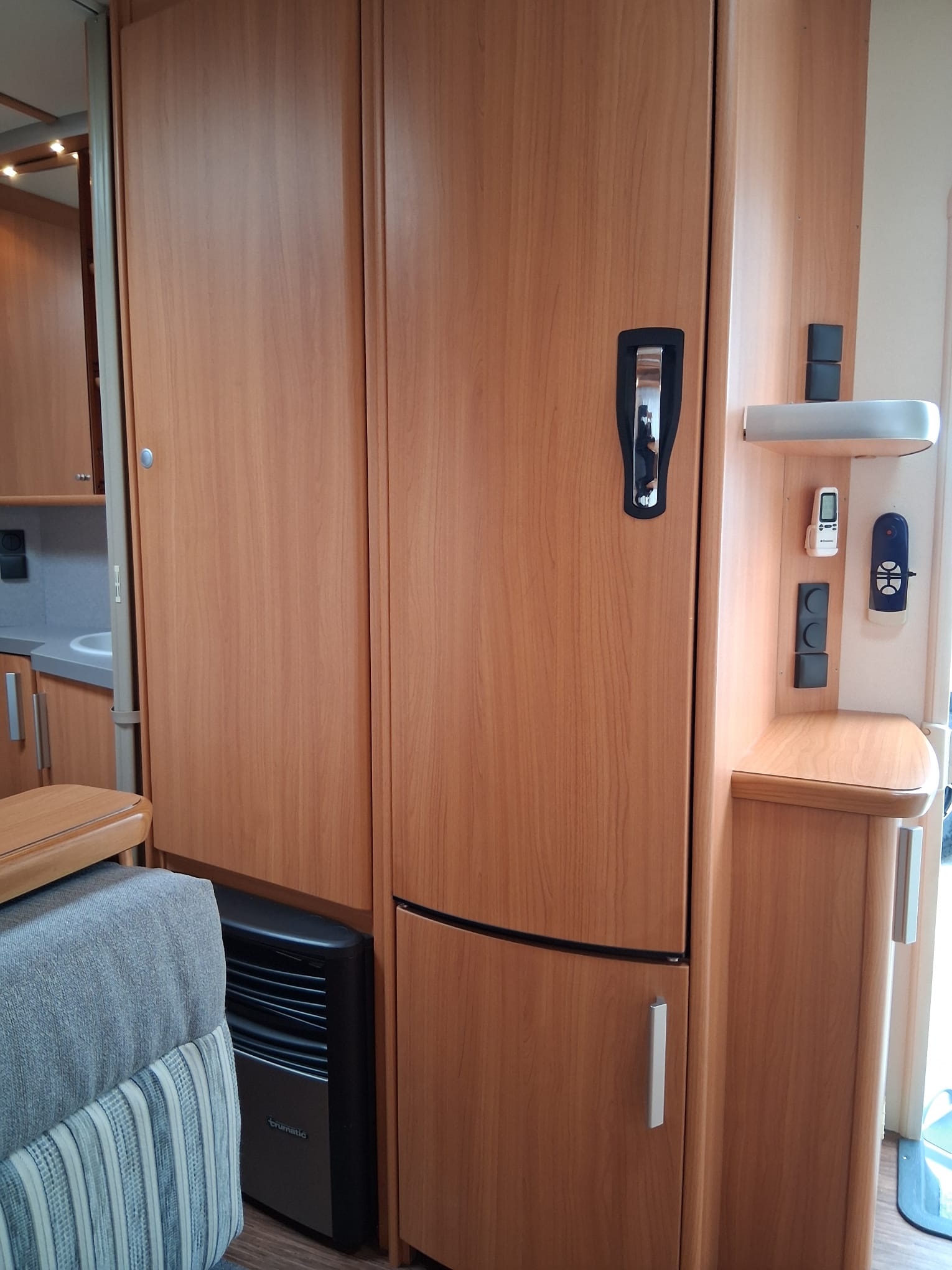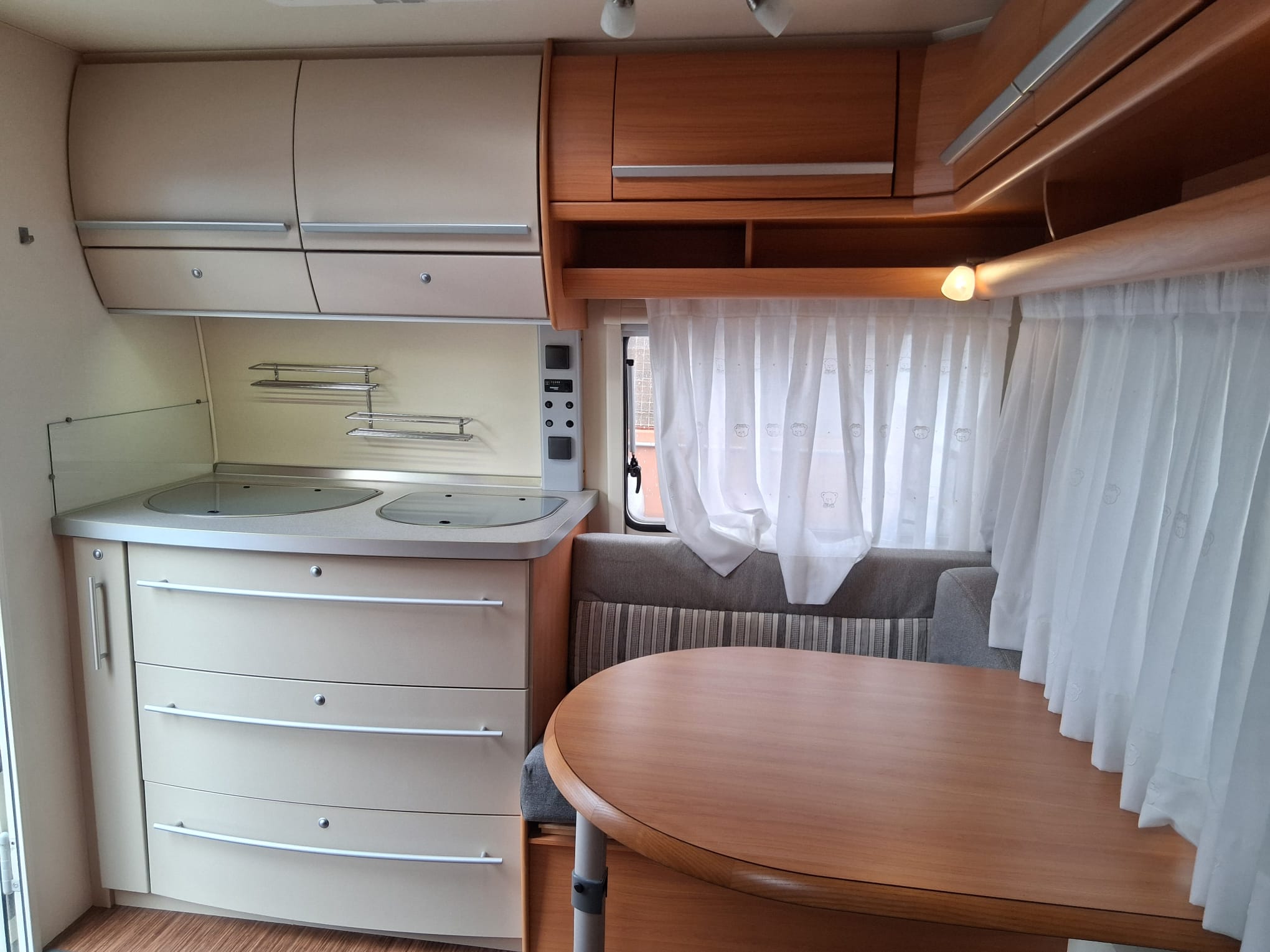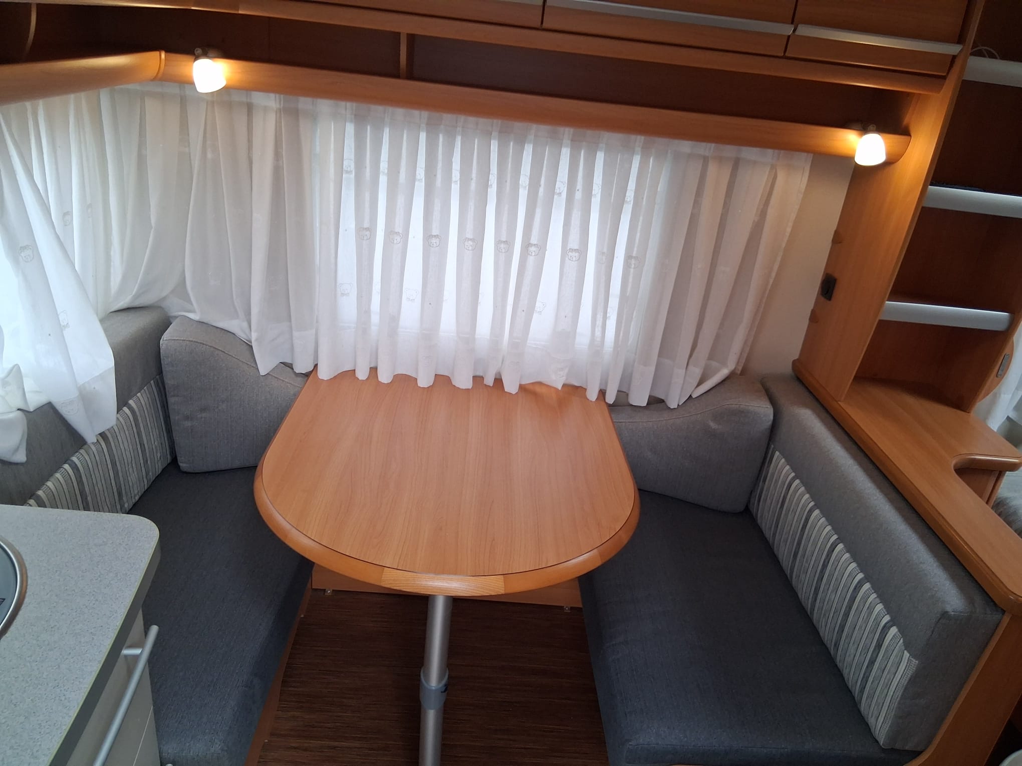 Caravana de ocasión con 4 plazas con cama francesa y salón transformable en cama con mucho equipamiento extra: mover, aire condicionado, nevera grande, estabilizador …..