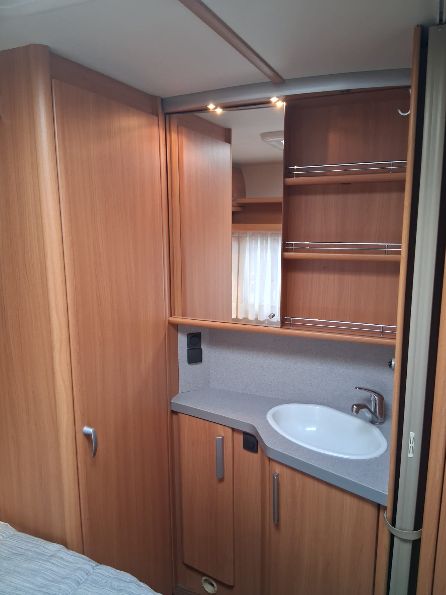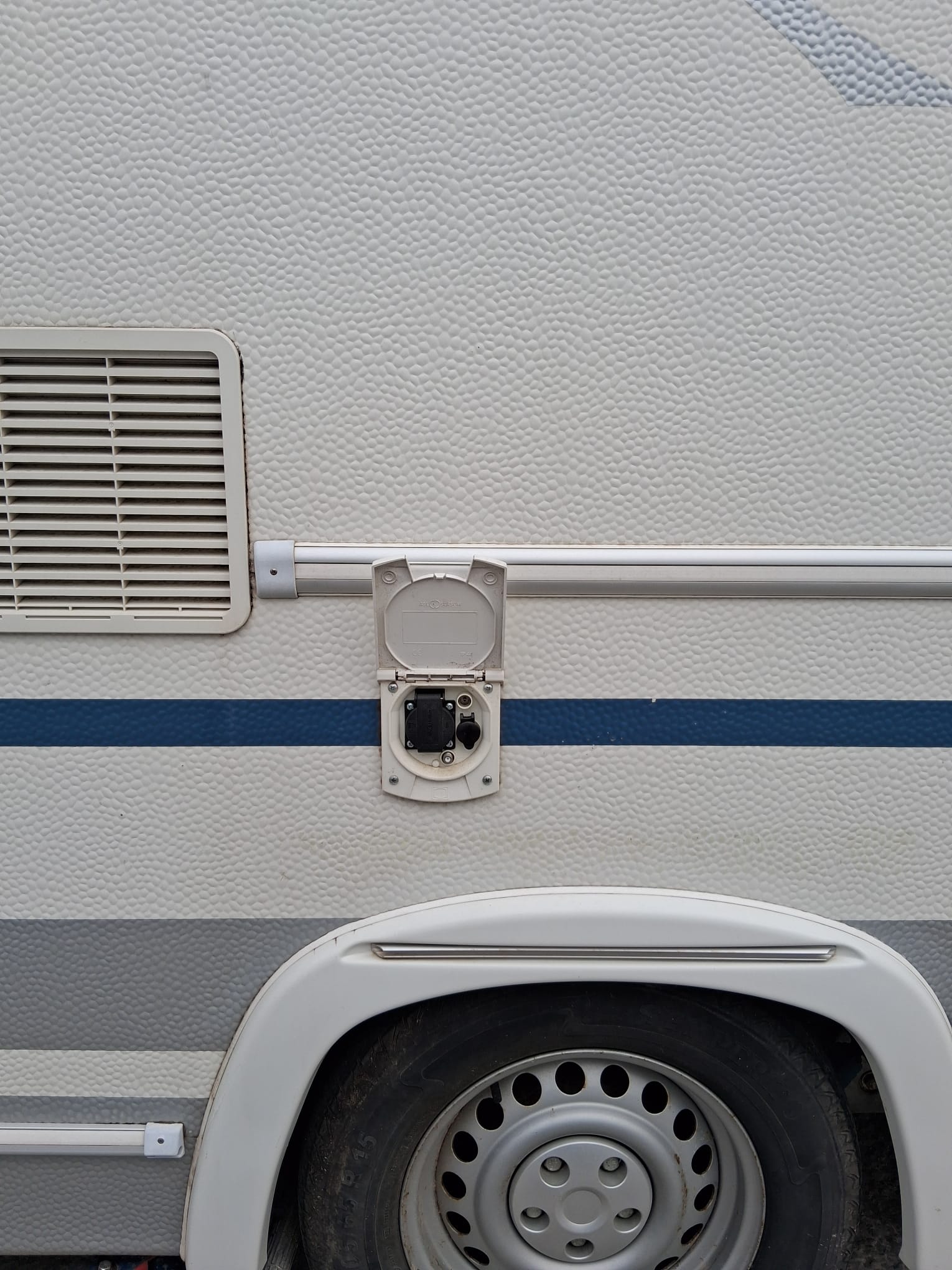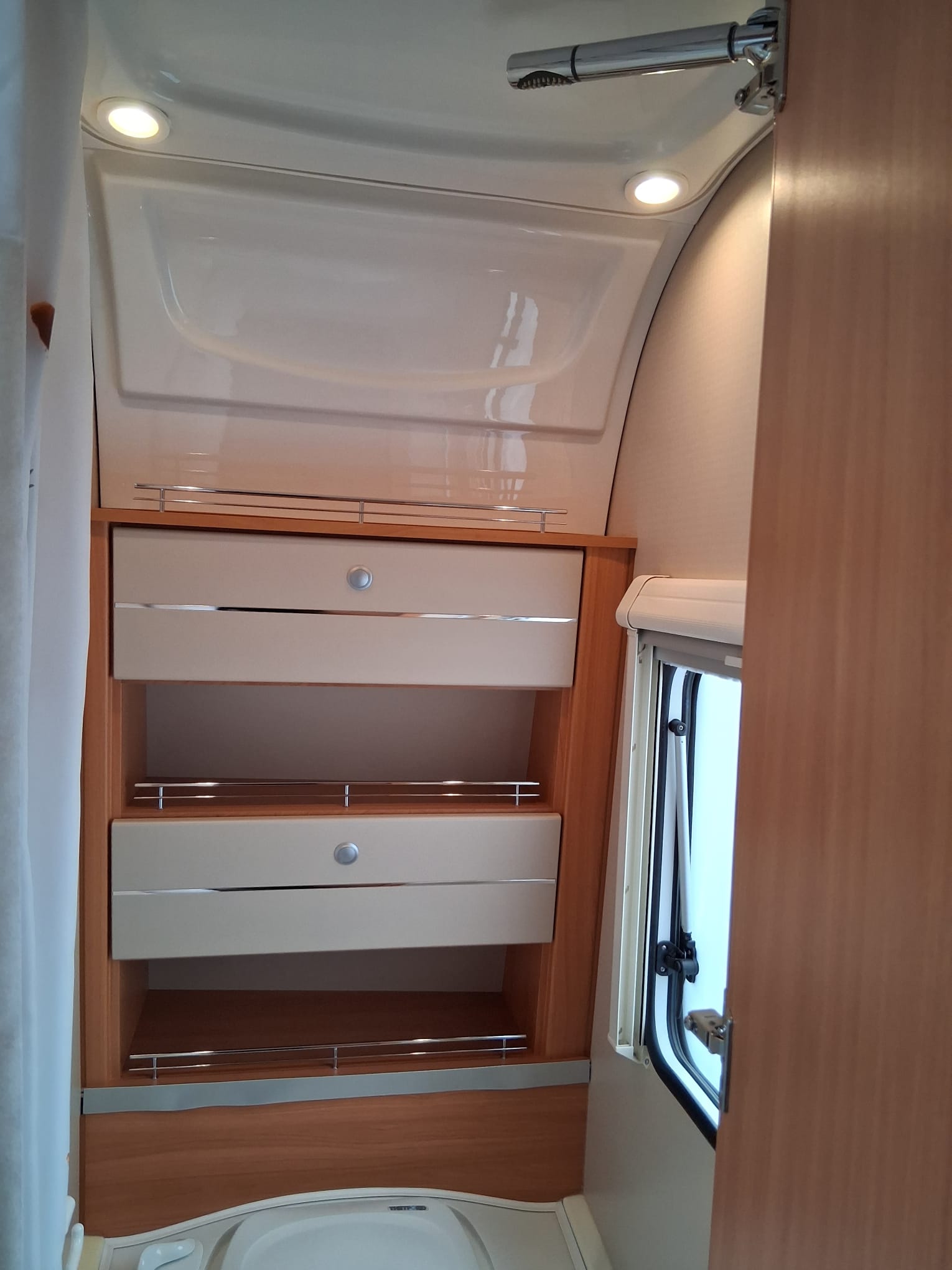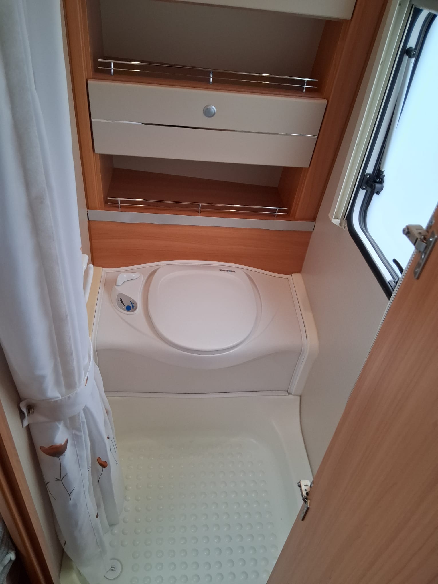 Caravana de ocasión con 4 plazas con cama francesa y salón transformable en cama con mucho equipamiento extra: mover, aire condicionado, nevera grande, estabilizador …..
